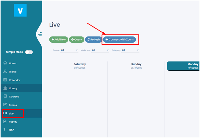 - After logging in, click on the Live page. You’ll see the ‘Connect With Zoom’ button, Click it
