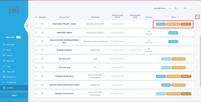 16- Admin & Eğitmen & Kullanıcı – Sınavlar – Sonuçlar sayfasına, İndir butonu
