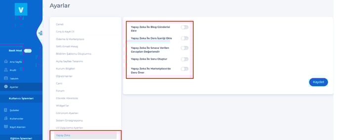 Entegrasyon bilgileri girildikten sonra, Admin – Ayarlar – Yapay zeka tabından