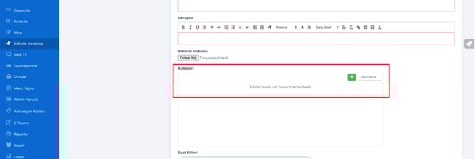 8- Etkinlikler – Kategori alanında veri yoksa veri yoktur mesajı verildi.