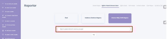 Eğitim paketi dönemi bazlı raporu içerisinde arama çubuğuna yazarak arama eklendi.