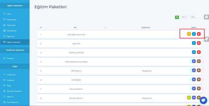 12- Eğitim paketleri sayfasında, Güncelle ve Ek süre tanımla butonların yerleri