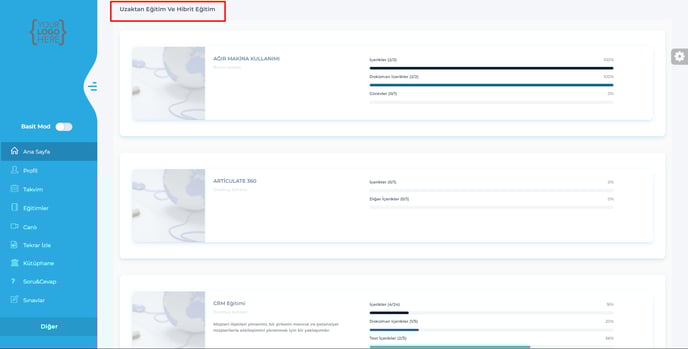 13- Kullanıcı – İlerleme sayfasına, uzaktan ve hibrit eğitimleri belirten bölüme