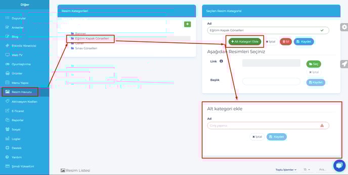 15- Resim havuzu – Alt kategori ekle butonuna basıldığında, kullanıcı dostu bir deneyim sağlamak amacıyla bir açılır çerçeve görüntülenecektir. Daha önce alt kategori ekleme işlemi doğrudan gerçekleştirilmekteydi.