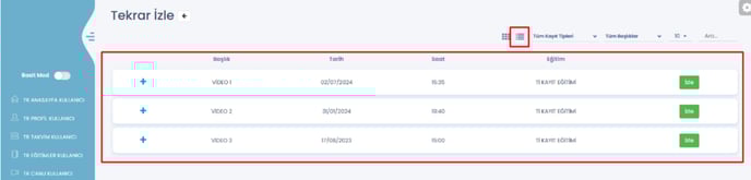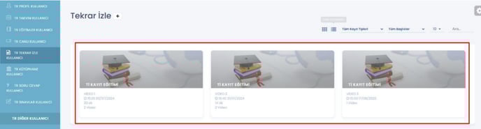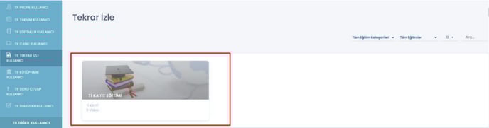 18- Kullanıcı – Tekrar İzle sayfasında görsel düzenlemeler gerçekleştirilmiştir. İlk girişte, kullanıcıların eğitimleri seçebileceği bir alan görüntülenecektir. İstenilen eğitime tıklandığında, o eğitimin canlısına ait videoya erişim sağlanabilecektir.