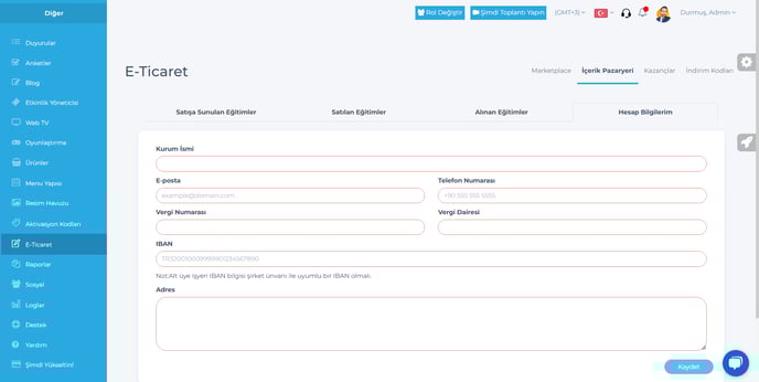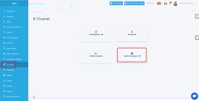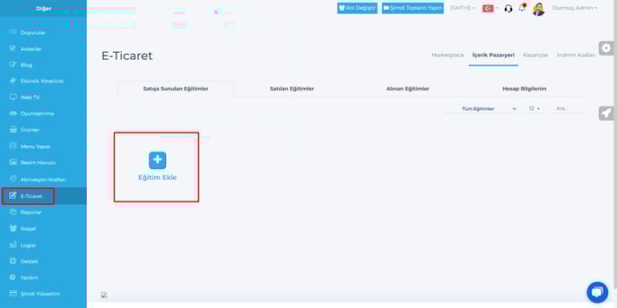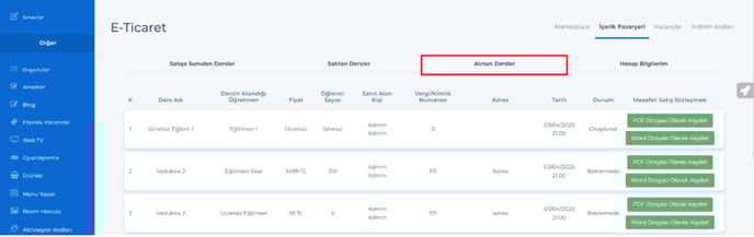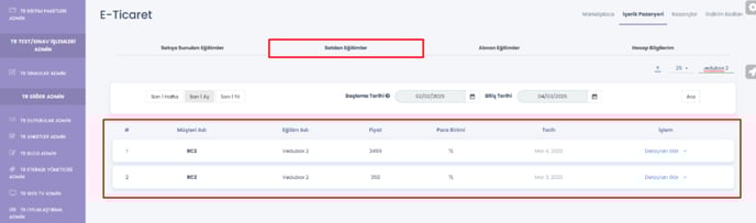 Sistemde satılan ve alınan eğitimlerin raporlarını İçerik pazaryeri menüsü altından