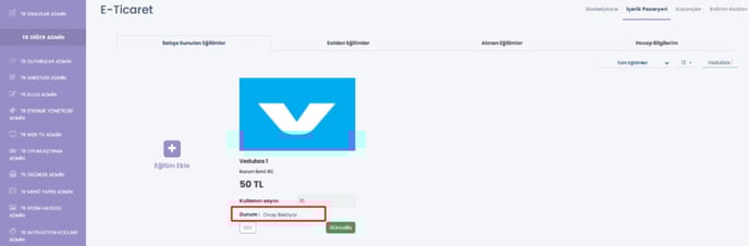 Tekrar satışa sunulan eğitimler alanına geçelim. Burada eğitimin durumunu gözlemleyebiliriz. "Onay bekliyor" ifadesi, eğitimin ETGİ GRUP tarafından onaylanmayı beklediğini belirtmektedir.