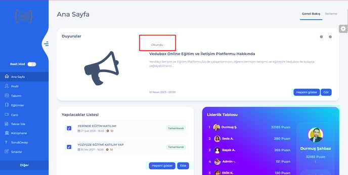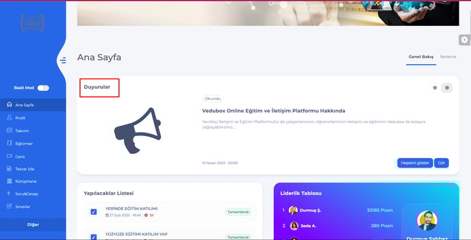 5- Kullanıcı – Ana sayfa – Duyuru Widget bölümünde duyuru yeniyse, Yeni duyuru