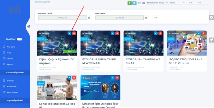 6- Etkinlik yöneticisi sayfasında bulunan, Etkinlik güncelle, sil butonları yeni