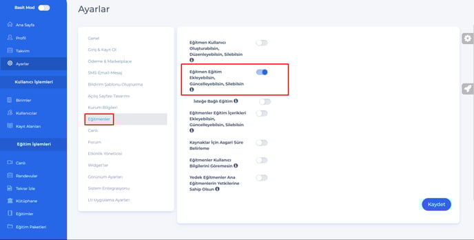 8- Admin – Ayarlar – Eğitmenler sayfasına, Eğitmenler eğitim içeriği ekleyebilsin