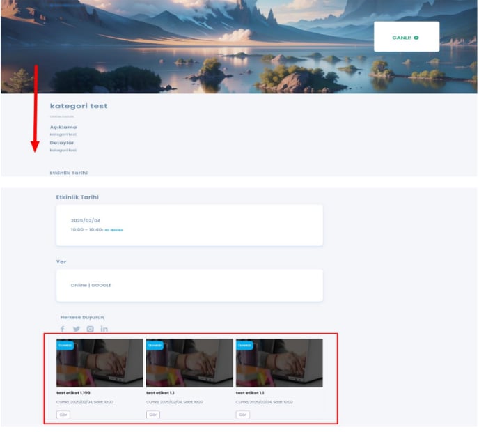 10 - Etkinlikler sayfasında, var olan etkinliğin altında, kullanıcı o kategori ve etikete