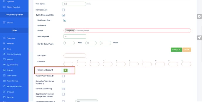11- Test havuzu – Ekle – Optik okuyucu etkin ayarı içerisine, Çözüm videosu alanı