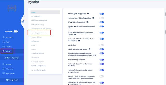 15- Admin – Ayarlar – Açılış sayfası tasarımı sayfası, Temel ve Gelişmiş olarak iki