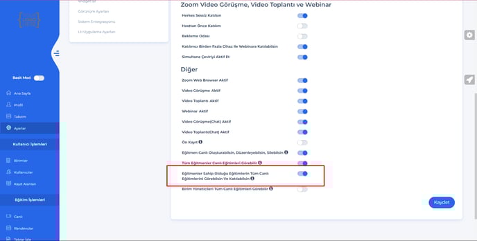 canlı eğitimlerini görebilsin ve katılabilsin ayarı eklendi.