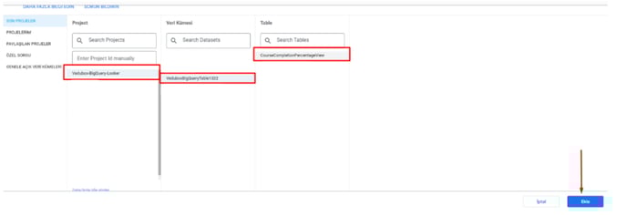 Açılan sayfada proje, veri kümesi ve tabloyu seçip devam edelim.