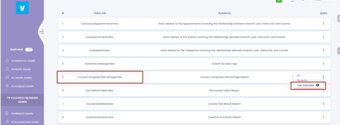 Seçtiğim rapora gidiyoruz, üç nokta – veri güncelle diyoruz. Verileri karşı tarafa