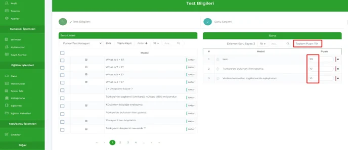 - Admin & Eğitmen – Sınavlar – Test havuzu – Ekle sayfasında adımda teste eklenen soruların puan bilgileri toplam puan şeklinde gösterildi.