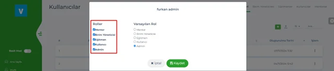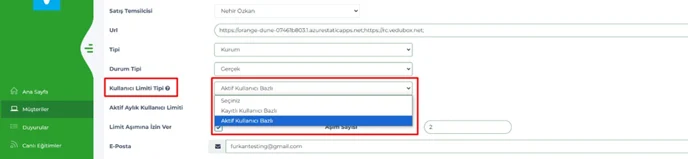 Eski düzende 1 admin, 1 eğitmen, 1 birim yöneticisi, 1 mentor ve 1 kullanıcı olan sistemde sadece kullanıcı sayılıyor ve 1 limit düşüyordu.