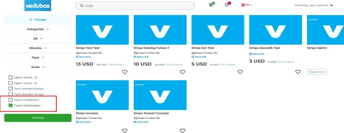 - Marketplace – Filtreler bölümüne, artan fiyat – azalan fiyat seçenekleri