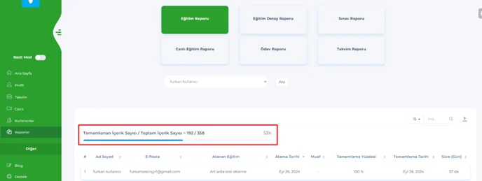 - Mentor – Raporlar – Eğitim raporu sayfasına eğitim ilerleme bölümü
