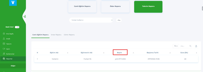 - Mentor – Raporlar – Takvim raporu sayfasına başlık sütunu