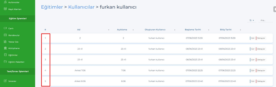 - Eğitimler – Kullanıcılar – Anketler tabında numaralandırma eklendi ve detaylar sayfası görünümü düzenlendi.