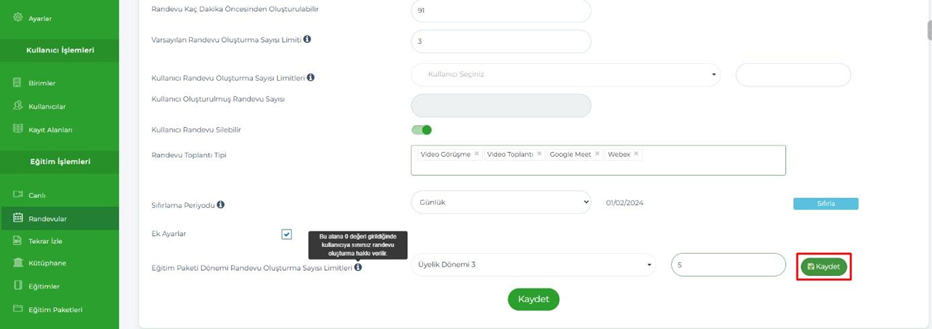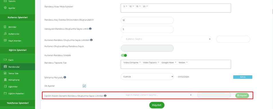 Bu bölüm altına, Eğitim paketi dönemi randevu oluşturma sayısı alanı eklendi.