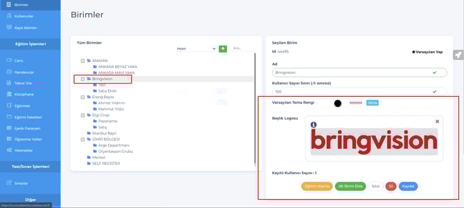 Birimler sayfasından tema ve logo eklenerek ilgili birim kullanıcılarına özel gösterim