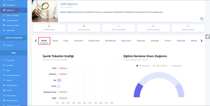 İçerikler ve Eğitimin genel ilerleme oranı takip edilebilecek.