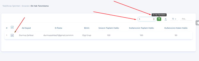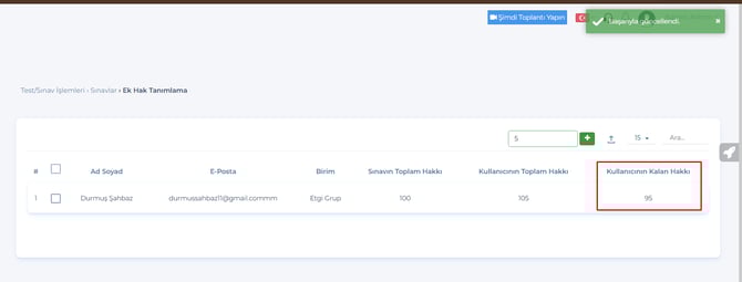 Sınavı almış kullanıcıların hak durumları açılan sayfadan güncellenebilecek.