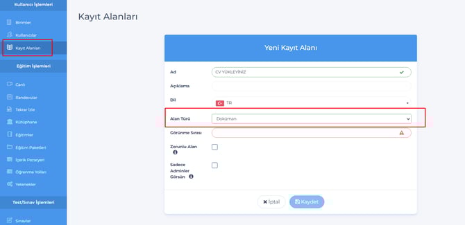 7- Admin – Kayıt alanları sayfasında alan türüne, Doküman tipi eklendi.