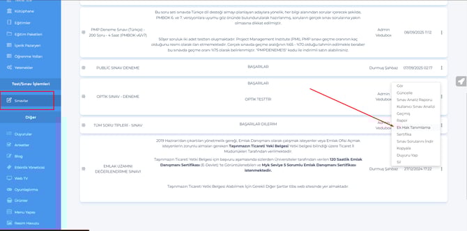6- Admin – Sınavlar – Üç nokta bölümüne, Ek hak tanımla özelliği eklendi.