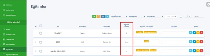 - Admin - Eğitimler sayfasına, Eğitim Puanı sütunu