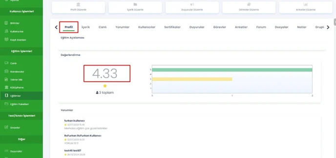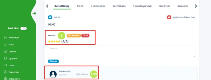 Kullanıcıların eğitim içerisinde verdiği puanların ortalaması burada gösterilecek.