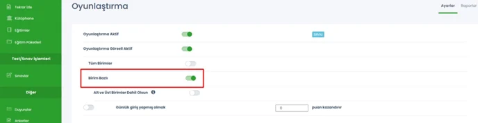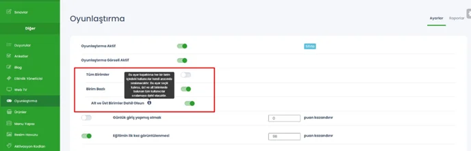 - Admin – Oyunlaştırma sayfasına, Birim bazlı puan sıralaması ayarı