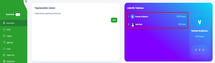 Birim bazlı ayarı seçildiğinde, kullanıcı bağlı olduğu birime göre puanları görecek.