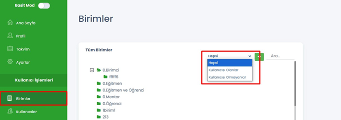 - Admin – Birimler sayfasına, Kullanıcısı olan ve olmayan kullanıcıyı listele filtresi eklendi.