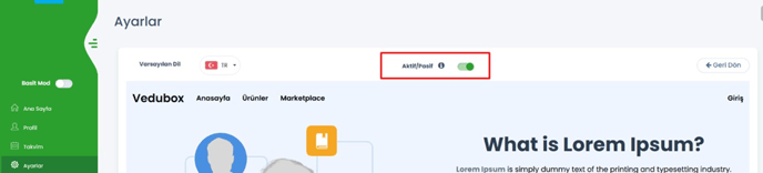 - Admin – Ayarlar – Açılış sayfası tasarımı sayfasında, Aktif – Pasif butonu üst bölüme taşındı.