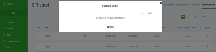 İndirim Kodları - Kullanıcı listesi bölümünde veri yoksa veri yoktur mesajı verildi.