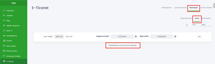 - Admin – E-Ticaret – Kazançlar – Satış tabında veri yoksa veri yok mesajı