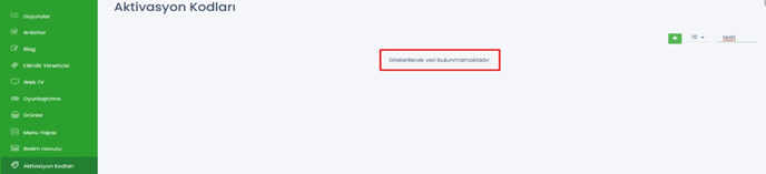 - Admin – Aktivasyon Kodları sayfasında veri yoksa veri yoktur mesajı