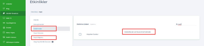 Katılımcılar ve Kayıt raporunda bulunan sayfalarda veri yoksa veri yok mesajı verildi.