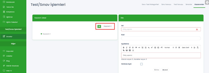 - Admin & Eğitmen – Sınavlar – Kazanımlar sayfası yeni görünüme göre düzenlendi. Search alanı eklendi.