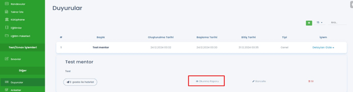 - Admin – Duyurular – Okunma Raporunda listede veri yoksa veri yok mesajı verildi.
