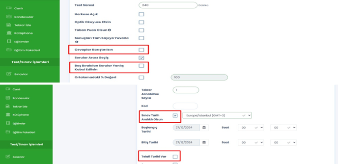 Tarih aralıklı mı? metni, Sınav tarih aralıklı olsun şeklinde düzenlendi. Telafi tarihi var mı? metni, Telafi tarihi var şeklinde düzenlendi.