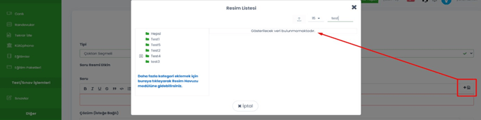 - Admin & Eğitmen – Sınavlar – Soru Havuzu – Resim ekle sayfasında açılan sayfada listede veri yoksa veri yoktur mesajı verildi.