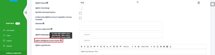 - Eğitimler – Profil – Eğitim bittiğinde anket göster ayarına İnfo eklendi.