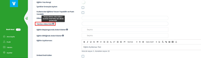 - Admin & Eğitmen – Eğitimler – Profil – Tanıtıcı Video Linki ayarına İnfo eklendi.