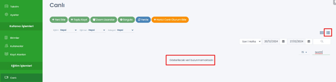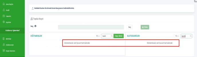 - Eğitimler – Toplu kayıt sayfasında listede veri yoksa veri yoktur mesajı verildi.