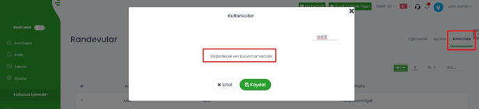 - Admin – Randevular – Kara Liste sayfasında listede veri yoksa mesaj verildi.